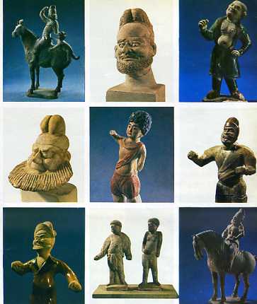 西安及其附近出土的三彩俑和彩绘陶俑,人物容貌不同、肤色不同、服饰不同,塑造了丝绸之路上的我国西北兄弟民族以及中亚、西亚、北亚、南亚等地各族人的形象。