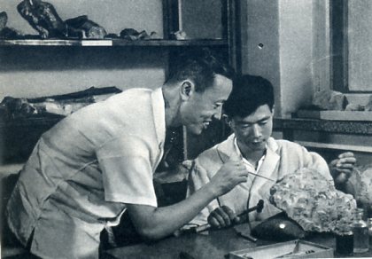 中国科学院古脊椎动物与古人类研究所所长杨锺健在观察猿人下颌骨。