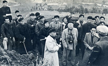 中国科学院古脊椎动物与古人类研究所所长杨钟健和蓝田现场会议的人员在蓝田猿人头骨发现现场参观。