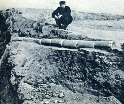 陕西省社会科学考古研究所,最近对两千多年前秦代都城遗址进行了部分勘察和发掘。从出土的遗址和遗物中,使人们对于秦代物质文化的特点和咸阳故都的位置、范围等,有了进一步的了解。这是遗址中的下水道。