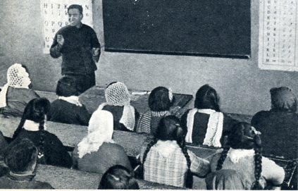 陕西省咸阳市滑城人民公社毛王沟生产大队的农民,解放前青壮年中90%是文盲。解放后,1949年他们开办了一所农民业余学校,这所学校一直坚持到现在已十四年。许多人通过学习提高了文化水平,一般都能写会算。图为业余学校上课的情形。