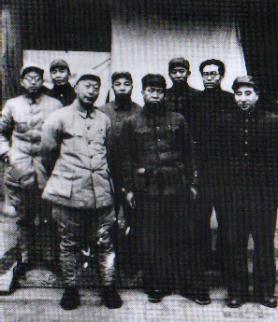 1948年11月29日至1949年1月31日,东北野战军同华北野战军合力进行平津战役。图为东北野战军和华北野战军负责人在平津前线司令部合影。左起,前排:华北军区司令员聂荣臻、东北野战军政治委员罗荣桓、东北野战军司令员林彪;后排:黄克诚、谭政、萧华、刘亚楼、高岗(中共中央东北局书记)。