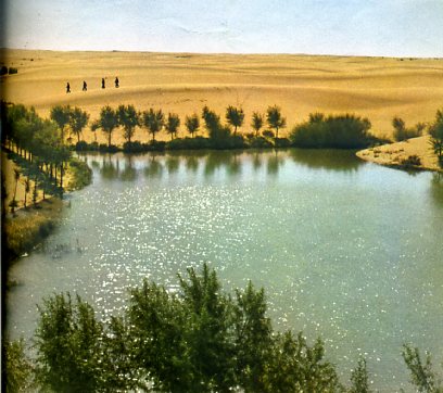 沙漠中修筑渠道,把水引进腹地后,出现了许多海子。这是榆林县牛家梁公社金子湾海子景象。