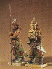 - 东西偏殿,有关羽、张飞等塑像。东西两廊,分别为文武廊房,塑蜀汉文官、武将28人,形态生动,塑像前均有小石碑,镌刻本人传略。诸葛亮殿正中为武侯贴金塑像,两侧为其子诸葛瞻、孙诸葛尚塑像。殿内外匾对甚多,最著者为清赵藩一联“能攻心则反侧自消,从古知兵非好战;不审势即宽严皆误,后来治蜀要深思。”诸葛亮像前,有铜鼓三面,称诸葛鼓,铸于公元6世纪以前。