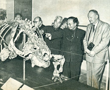 中国科学院在10月22日举行隆重仪式,接受苏联科学院赠送的一批珍贵礼物。图为中国科学院院长郭沫若(右第二人)、苏联科学院古生物博物馆馆长弗达罗夫(右第一人)和中国科学院古脊椎动物专家裴文中(右第三人)参观苏联赠送的卡尔宾斯基头甲龙化石。这种原始爬行动物生存于离今约2万万年前的二世叠后期。