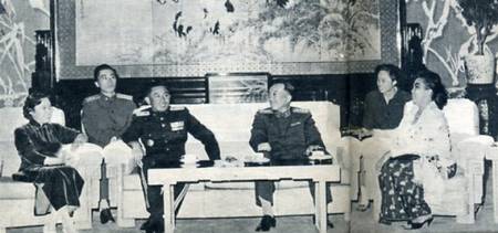 印度尼西亚军事友好代表团团长、印度尼西亚共和国部长兼陆军司令艾哈迈德?亚尼少将和夫人以及代表团全体成员,四月二十七日到达北京。国务院副总理兼中国人民解放军总参谋长罗瑞卿大将四月二十七日会见了艾哈迈德?亚尼少将和他率领的印度尼西亚军事友好代表团。左起:罗瑞卿大将夫人、艾哈迈德?亚尼少将、罗瑞卿大将、亚尼少将夫人。(1963年)