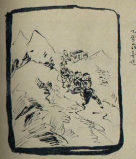 绘画的同志同时也拿起笔,在战斗和行军的间隙里,画下不少画。而当时绘画的条件也是很差的。纸只能是拿到什么纸就用什么纸。往往十几张画就有好几种不同的纸。墨也往往没有,更多用的是锅底灰。有时毛笔也没有,自己用麻扎起来代用。可惜的是当年很多同志的作品都已散失了。黄镇同志所作的也只留下极少的一部分。而这些画的原稿,现在也还没有找到。这里发表的是根据1938年在上海出版的“西行漫记”复制的。