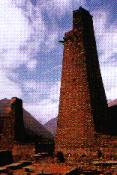 联接川西平原和四川北藏族自治区的成(都)阿(坝)公路理县薛城镇到山脚坝段,已于2月中旬通车。悬旗结彩的汽车正在通过理县日底寨大桥。(1954年)