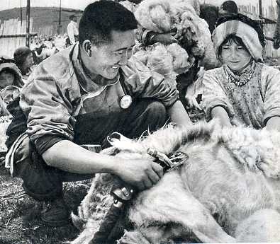 阿坝藏族自治州委书记、唐克公社一队党支部书记旦真(左)和社员一起剪羊毛。