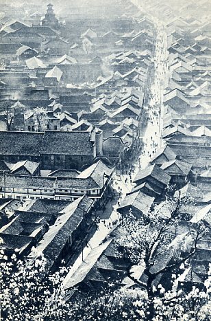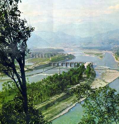 都江堰的分水鱼嘴,系用块石砌成的分水堤埂,把岷江分成“内江”和“外江”。因它的形状像鱼,所以叫做“鱼嘴”,是都江堰最重要建筑物之一。图上部系“内江”开流后所留“杩槎”的一部。