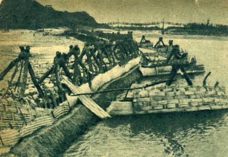 都江堰的杩槎。要在内、外江实施各项修理工程,必须先行“截流”,截流的主要工具就是“杩槎”,系用竹、木、粘土,卵石四种材料做成,互相连接,顺次前进,达到断流的目的。
