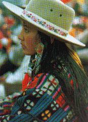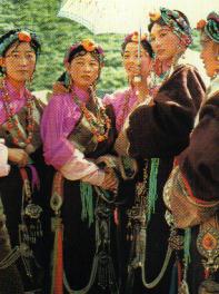 戴毡帽的藏族女子。甘孜藏族的毡帽十分漂亮。印花氆氇袍上的十字纹“加珞”反映出他们对太阳的崇拜。十字纹的组合构成美丽的图案,寓意为慈善、爱护、与人为善。“加珞”是藏族的典型饰纹样,常用于藏袍和藏靴上。