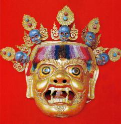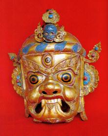 藏族铜面具—金钢力士。藏面具素以形式精美着称,无论怎样诡奇可怖的面孔,皆做工精细,追求绚丽华美的效果。其中铜面具所具有的精湛技艺是其它民族的面具所不及的。藏面具分为跳神和藏戏两类。跳神面具以本教的各种神灵和密宗佛教的神佛、法王、金钢、鬼怪为主要造型;藏戏面具是在跳神面具的基础上发展起来的,跳神面具亦常用于藏戏表演中。