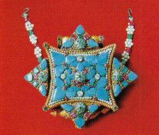 藏族女子胸前佩饰。藏族女子胸前佩饰镶嵌有红、蓝、绿宝石和珍珠、绿松石等,十分华贵富丽。