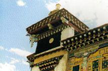 则列寺大殿双层雕龙角挑梁。则列寺为藏传佛教宁玛派(红教)寺院。