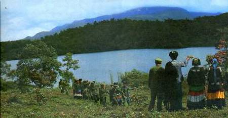 人民解放军某部来到一九三五年工农红军总参谋长刘伯承和彝族首领小叶丹结盟的“海子”湖边参观学习。