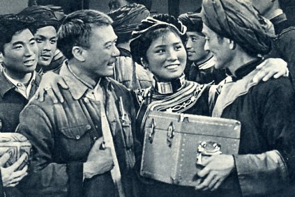 电影《达吉和她的父亲》中的一个镜头:达吉(中)和她的汉族生父(前左)、彝族义父(右)团聚在一起。这部电影是参照真实的故事创作的。下面介绍的便是真实的达吉和她的父亲。