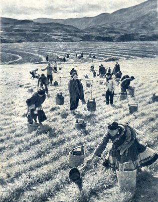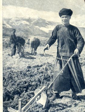 1958年凉山农业大丰收,每人平均能分到粮食800斤。今年,农民生产的劲头更高了,男女青年正在麦田里进行管理。