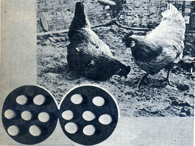 四川营山县城附近人民公社的养鸡场有几只母鸡一天能下三个、甚至四个鸡蛋,蛋的大小、形状和一般鸡蛋一样(见左边,右边是普通鸡蛋)。这几只鸡是用新方法饲养的,用酒糟拦饲料,一天喂六至八次,晚上鸡棚里用电灯照亮,使鸡能象白天一样觅食。(1959年)