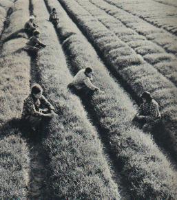 营山县各人民公社决定在高产试验田里,从种到收的全套耕种技术和管理措施都详细记录下来,以便以后总结丰产经验。这是小麦专业队在麦田里定苗留株。(1959年)