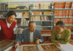 与青年学者一起研究敦煌壁画艺术成就。