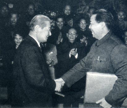 中国人民对外文化协会和日本中国文化交流协会,1963年12月27日在北京签订一项关于中日两国人民间文化交流的共同声明。图为中国人民对外文化协会副会长阳翰笙(右)和日本中国文化交流协会理事长中岛健藏(左)在共同声明上签字后热烈握手。