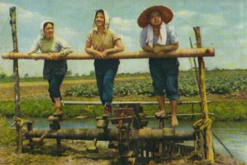 上海天马电影制片厂下放到农村劳动锻炼的演员们在车水。自左至右:上官云珠、王丹凤、张干。(1958年)