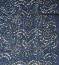 金鸡报晓蓝印花布。这是典型的鲁西地区蓝印花布,与鲁西地区其它民间美术如剪纸、年画、刺绣、土布等风格特点极为相似。