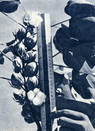 多产的棉花。山东临清市古柚人民公社的一个青年试验场培植的四千株“临清跃进一号棉”,株高都在五尺左右,平均每株结桃160-170个。(1959年)