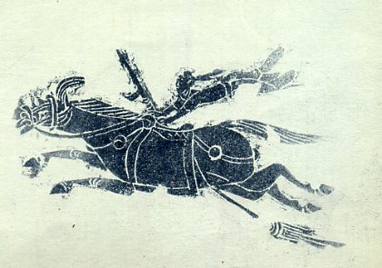 在山东省沂南县北寨村一所汉代古墓里,有一幅“乐舞百戏”巨型壁刻,其中有一部分是专门描写马戏的。考古工作者研究后认为,中国马戏在一千八百年前已有相当高超的水平。这是古墓里关于马戏的壁刻。(1962年)