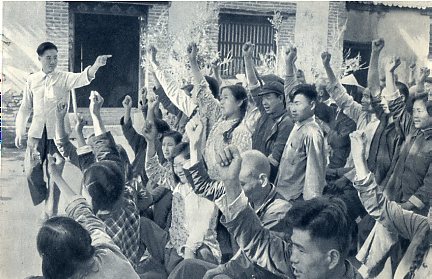 社主任王灿亭(最右)接受社员意见,带头参加劳动。