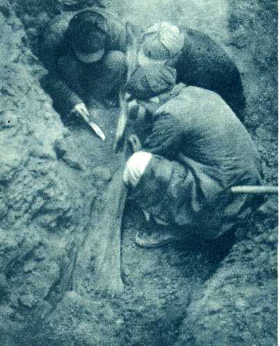 在山东莱阳金刚口西南挖掘恐龙化石之情形。