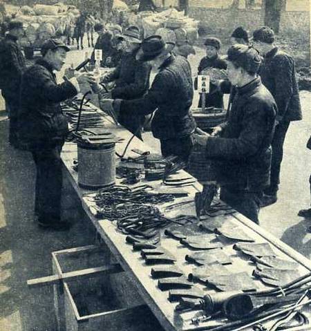 山东省莱阳县南西留联村供销合作社的农具供应站上陈列着肥田粉、喷雾器和各种手工业农具的样品,供农民们选购。