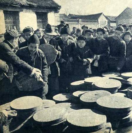 社员们在饼肥供应站上买花生饼。这些花生饼是供销社加工组自己制造的。