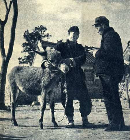 社员田方(左)从供销合作社的信货部贷了一部分钱,凑上他原来的积蓄,买了一头驴。