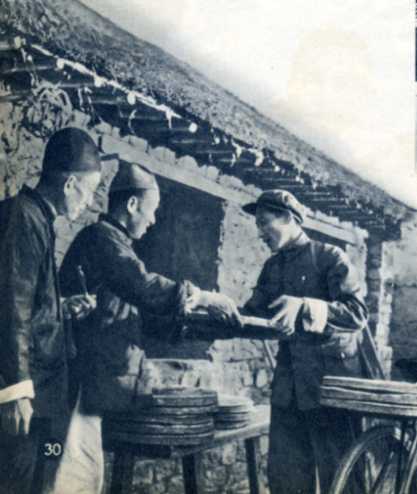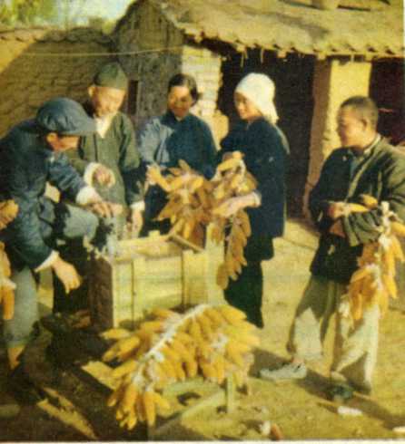 “送货下乡”小组把农业社订购的喂牲口的豆饼送来了。