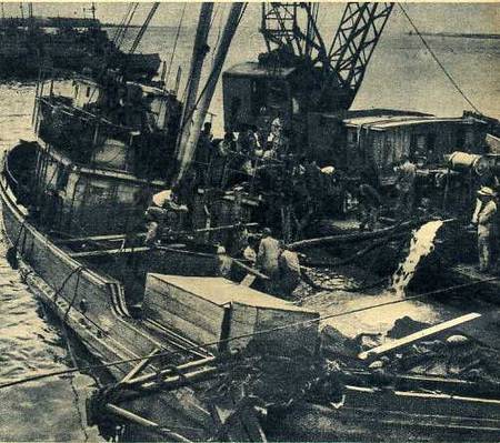沿海各主要渔场,在解放前夕,大都遭到蒋匪的破坏,渔输和海洋渔帆船被劫走、击沉,所乘无几。解放后人民政府对华东区的渔业积极进行了恢复和重建。这里是国营上海水产公司把沉船起捞后,进行抽积水的工作。