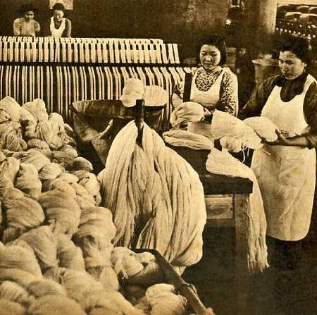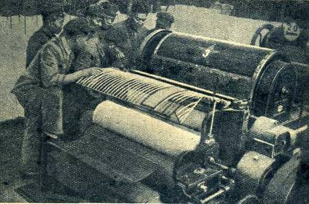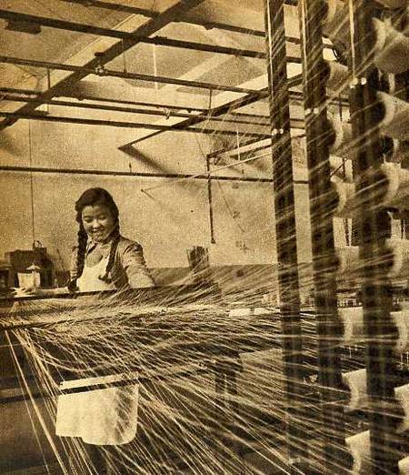 国营上海第十棉纺织厂整经间女工在爱国增产的号召下,都专心地在经纱车上工作,随时注意拆出错支纱头和油纱,使次布减少。