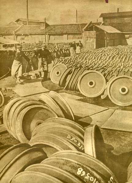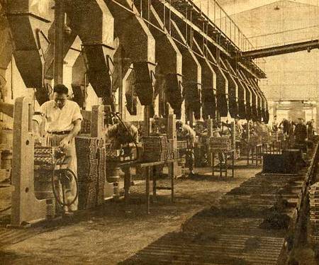 铸造车间。楼上的皮带送砂机自动将砂送至各造型机上,全机只需一个操纵。