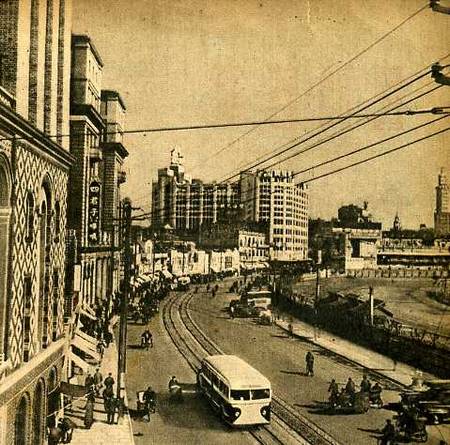 行驶在南京路上的新式公共汽车。它一直驶到各工人住宅,让工人都能搭上舒适的交通工具去工作。