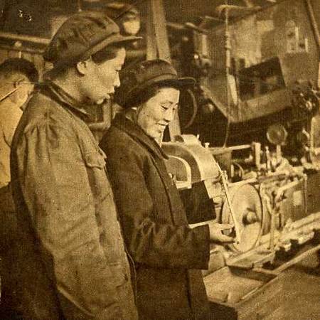 朱培先(左)被介绍到国营上海第二纺织机械制造厂做车床工。