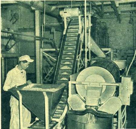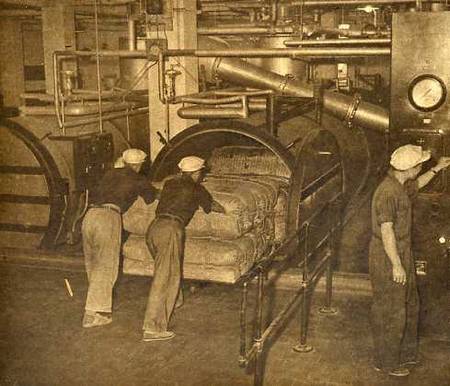 上海烟草公司的工人们正把成包的烟叶送入真空调节回潮机,利用机器的真空作用排除烟叶的异味,并杀灭其中的微生菌,以保证吸烟者的健康。