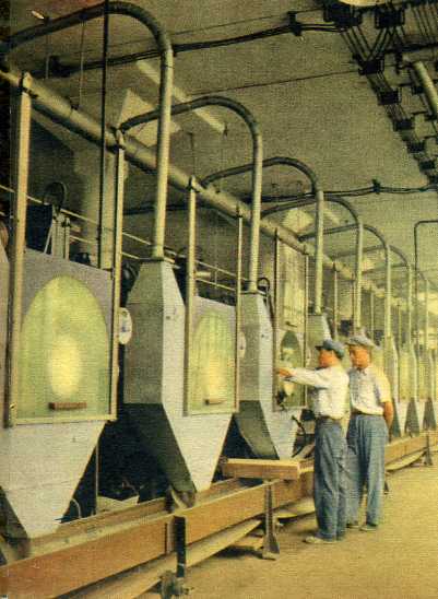 上海烟草公司由原料到成品的每一生产过程,都经过工人们的细密检查,使产品的质量合乎规格。这是公司卷烟厂女厂长洪琪(右)和工人正在卷烟机旁检视烟条。