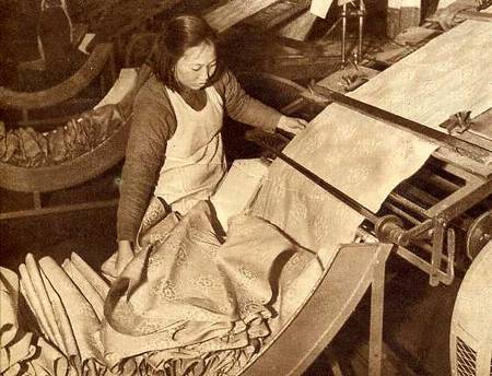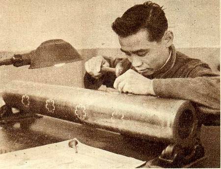 国营上海第一印染厂熟练的刻印员张凤翔正用机器雕刻4套色民族风格的鸳鸯花样。