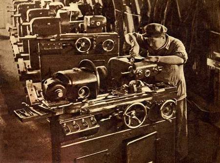 厂里生产的机床,精密度有的不能相差千分之五米厘(mm)。工作人员正在用工具显微镜检验新制成的机器零件。