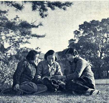 王英美(中)和同学们在校园里谈论她所喜爱的读物。她原是上海丽新纱厂的工人,而且8岁起就进纱厂当徒工人。