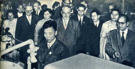 德意志民主共和国副总理奥•努舍克(前排右起第5人)夫妇参观1954年莱比锡国际博览会上的上海机床厂产品3160式磨床。