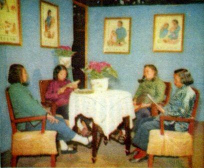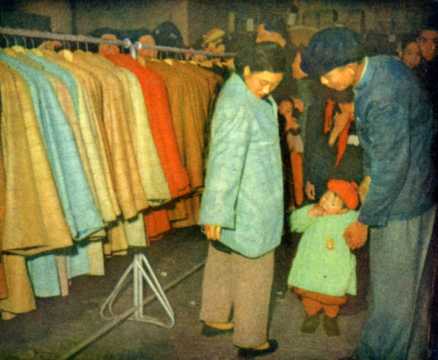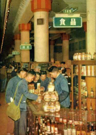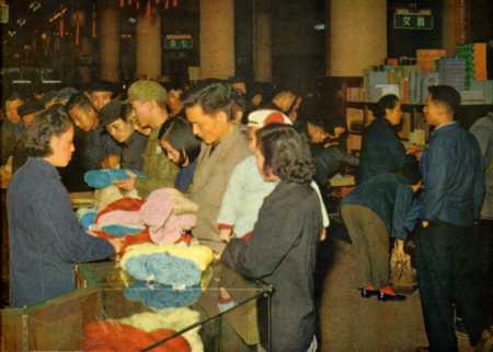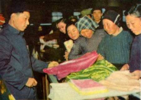 郊区虹桥村的农民李梅仙(右第二人)的儿子快要结婚了,她特地来买了两条绸被面和许多其他的东西,准备回去办喜事。