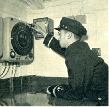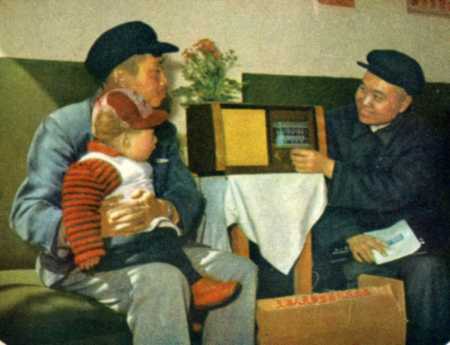 在商店的休息室里,上海正泰橡胶厂的职员彭文祥(右)正在试用新买的收音机。