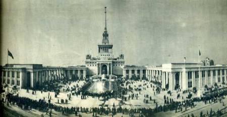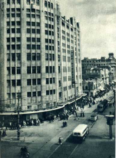 苏联经济及文化建设成就展览会3月15日起移至上海市新建的中苏友好大厦内举行。图为中苏友好大厦外景。